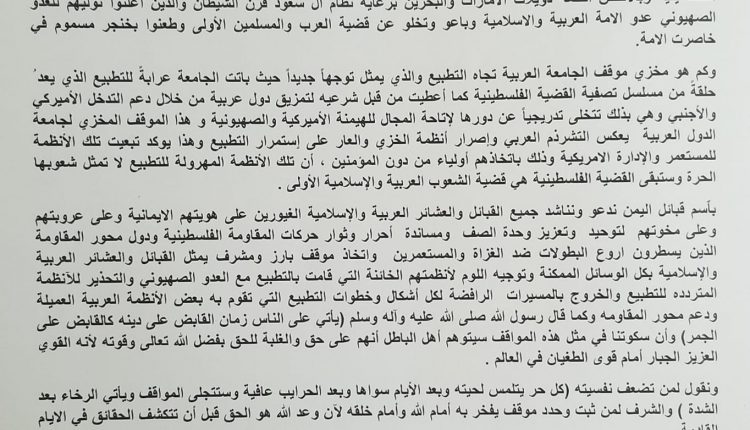 واستنكر البيانُ موقفَ الجامعة العربية المخزي تجاه التطبيع والذي يأتي في إطار مسلسل تصفية القضية الفلسطينية.. معتبرًا أن هذا الموقف المخزي لجامعة الدول العربية يعكس إصرار أنظمة الخزي والعار على استمرار التطبيع والتبعية للإدارة الأمريكية.