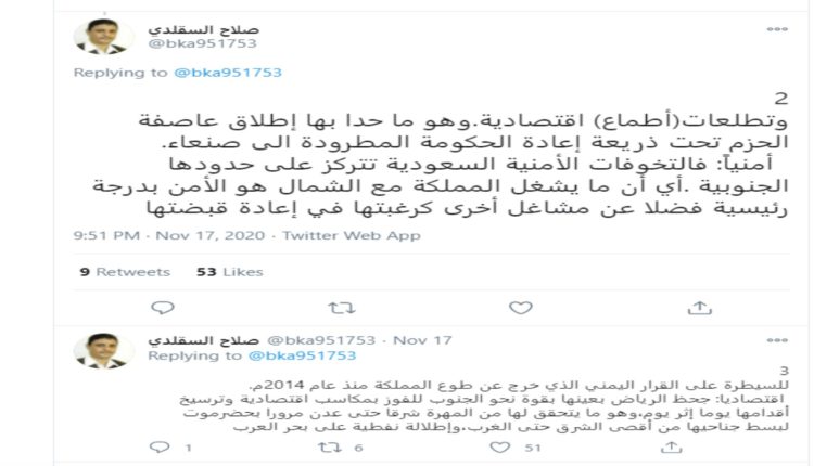 وقال السقلدي في تغريدة له على حسابه في موقع تويتر : للسعودية مطامع اقتصادية وهو ما حدا بها إلى إطلاق عاصفة الحزم تحت ذريعة إعادة الحكومة المطرودة الى صنعاء.
