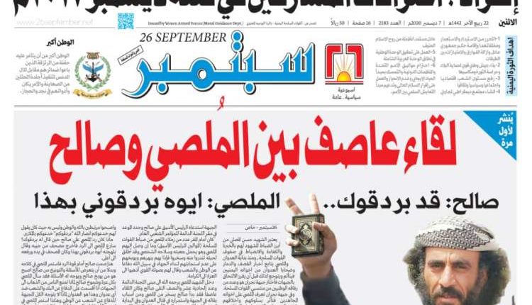قالت مصادر في صحيفة 26 سبتمبر التابعة لوزارة الدفاع في حكومة صنعاء أن الصحيفة ستنشر في عددها الصادر غداً الإثنين تفاصيل اللقاء الذي جرى بين الرئيس الأسبق علي عبدالله صالح وقائد القوات الخاصة بالحرس الجمهوري العميد حسن الملصي والذي جرى تسريب بعض تفاصيله خلال الأعوام الماضية واشتهر بعبارة صالح التي قالها للملصي “قد بردقوك” في إشارة إلى قوات صنعاء وجماعة أنصار الله.