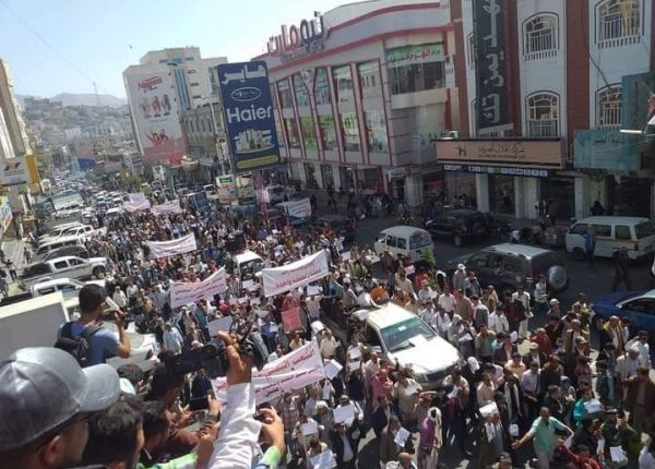 تظاهرة حاشدة في مدينة تعز تندد بإنهيار العملة وتطالب باستثمار موارد البلاد وتفعيل الموانئ
