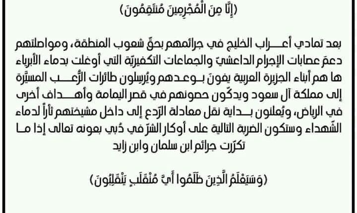 وتوعد البيان أن تكون الضربة القادم على ما وصفه بأوكار الشر في دبي إذا ما تكررت جرائم ابن سلمان وابن زايد.. وفقاً للبيان.