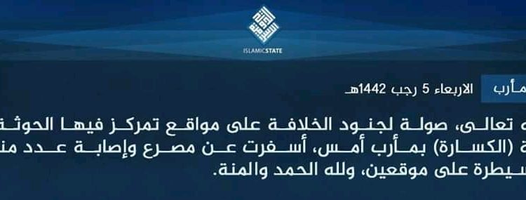 وقال البيان، “بتوفيق الله تعالى صولة لجنود الخلافة على مواقع تمركز فيها الحوثيين المشركين في جبهة الكسارة بمأرب، يوم أمس”.