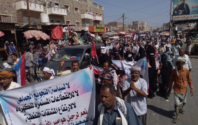 وطالب المتظاهرون بإقالة المحافظ الموالي للرئيس هادي , احمد تركي، وتحسين الخدمات، والحد من الفورة السعرية.