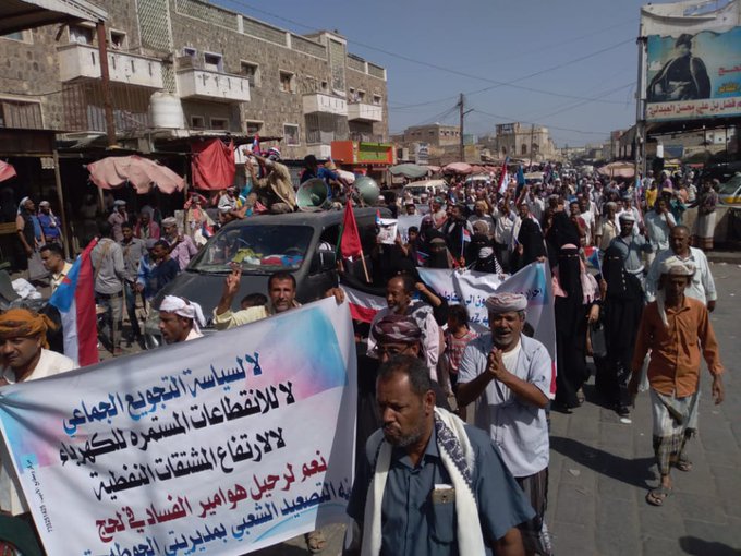 تظاهر المئات من المحتجين العسكريين الموالين للمجلس الانتقالي الجنوبي في مدينة الحوطة مركز محافظة لحج تنديدا بانهيار الاوضاع المعيشية وتردي الوضع الاقتصادي في ظل إنهيار العملة .