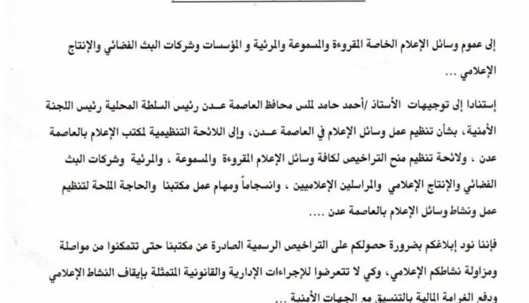 وجاء في التعميم الذي صدر عن سلطة الانتقالي في المحافظة، فرض استصدار تصاريح عمل لكافة وسائل الإعلام عبر مكتبه في عدن، مهددًا بإغلاق ومحاسبة أي وسيلة إعلامية تمارس عملها دون إصدار تصريح من المكتب ومحاسبتها.