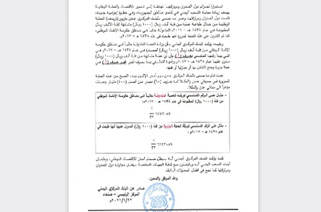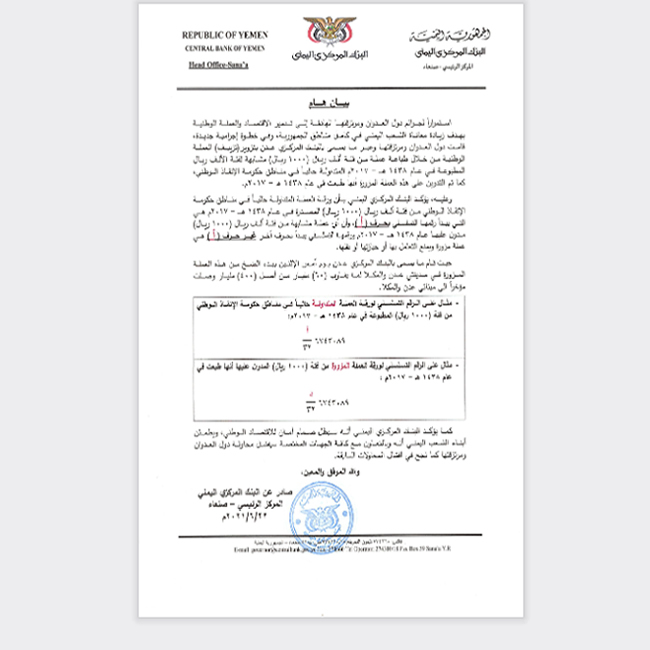 وعليــه، يؤكد البنك المركزي اليمني بأن ورقة العملة المتداولة حالياً في مناطق حكومة الإنقاذ الوطني من فئة ألف ريال (1000 ريال) المصدرة في عام 1438 هـ – 2017م هي التي يبدأ رقمها التسلسلي بحرف ( أ)، وأن أي عملة مشابهة من فئة ألف ريال (1000 ريال) مدون عليها عام 1438 هـ – 2017م ورقمها التسلسلي يبدأ بحرف أخر غير حرف ( أ) هي عملة مزورة ويمنع التعامل بها أو حيازتها أو نقلها.