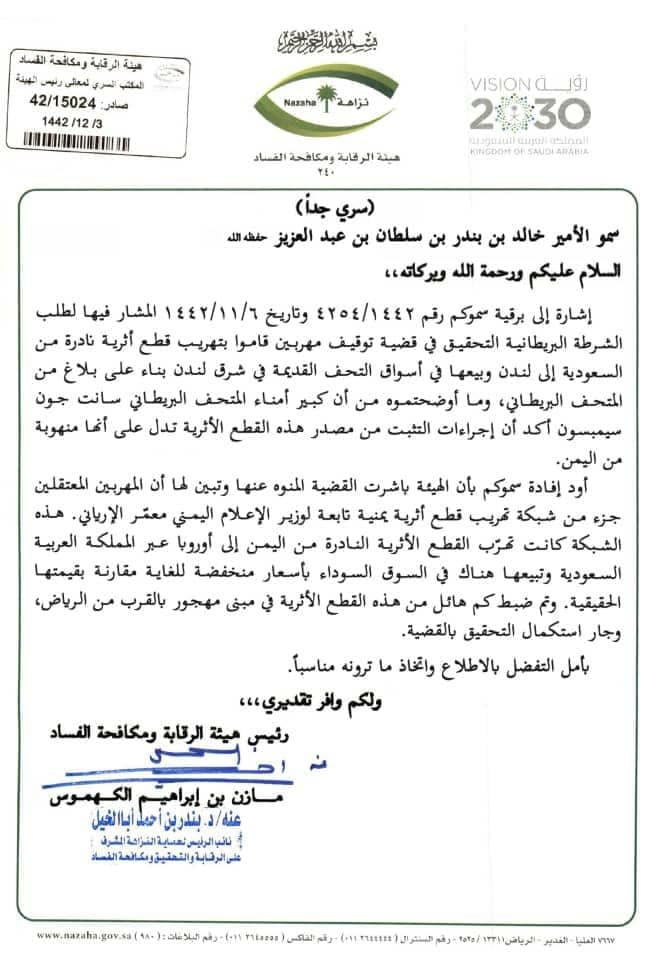 ووفقاً للوثيقة فإنَّ الشرطةَ البريطانيةَ ألقت القبضَ على مهربين سعوديين في لندن، وأخبرت السفارة السعودية في لندن بذلك، والسفارةُ طلبت من هيئةِ الرقابة ومكافحة الفساد في السعودية التحقيقَ في القضية.