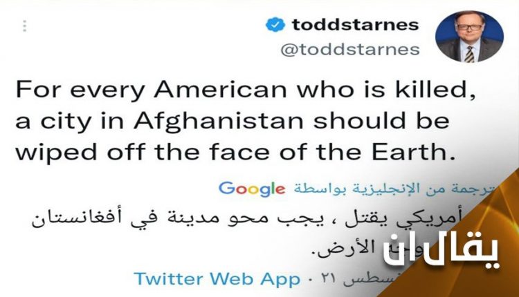 “في مقابل كل امريكي قُتل في الهجوم على مطار كابول، لابد من محو مدينة افغانية عن وجه الارض”، هذا الكلام العنصري، هو تغريدة للكاتب والمذيع الامريكي تود ستارنز، فهذا الوحش يطالب بمحو 13 مدينة افغانية بساكنيها عن وجه الارض، إنتقاما لمقتل 13 عسكريا امريكيا سقطوا في التفجير الانتحاري الذي وقع في مطار كابول الخميس الماضي.