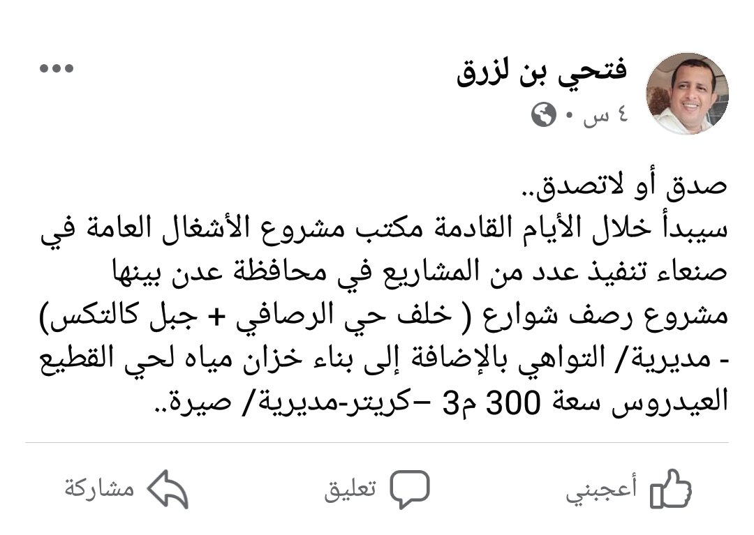 وقال في منشور له على الفايسبوك: صدق أو لا تصدق..سيبدأ مكتب الأشغال العامة في صنعاء خلال الايام القليلة القادمة تنفيذ عدد من المشاريع في عدن، مشروع رصف شوارع ( خلف حي الرصافي + جبل كالتكس) – التواهي، وبناء خزان مياه لحي القطيع العيدروس سعة300م3 – صيرة.
