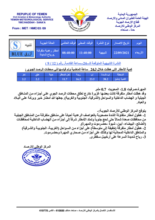 كما توقّعت في بيان لها، هطولَ أمطار متفرقة (خفيفة إلى متوسطة) على أجزاء من السواحل (الغربية، الجنوبية والشرقية) والمناطق الداخلية المحاذية لها وكذلك على أجزاء من صحاري المهرة وحضرموت.