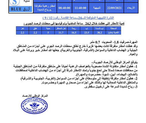 كما توقّعت في بيان لها، هطولَ أمطار متفرقة (خفيفة إلى متوسطة) على أجزاء من السواحل (الغربية، الجنوبية والشرقية) والمناطق الداخلية المحاذية لها وكذلك على أجزاء من صحاري المهرة وحضرموت.