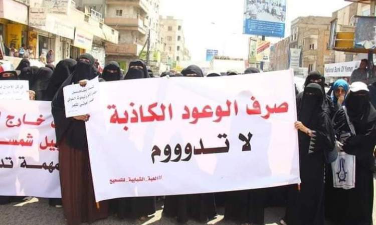 وردد المتظاهرون شعارات تحمل التحالف وحكومة هادي مسؤولية انهيار العملة وتردي الأوضاع الإقتصادية للمواطنين.
