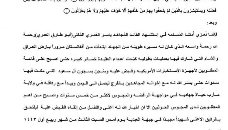 وقالت قاعدة الجهاد التابعة لتنظيم القاعدة في بيان صادر عنها منذ يومين: “نعزي أمتنا الإسلامية في إستشهاد القائد المجاهد “ياسر العمري” المُكنى “أبوطارق العمري” الذي كان له مسيرة طويلة من الجهاد إبدأت من إفغانستان مروراً بأرض العراق والشام”.