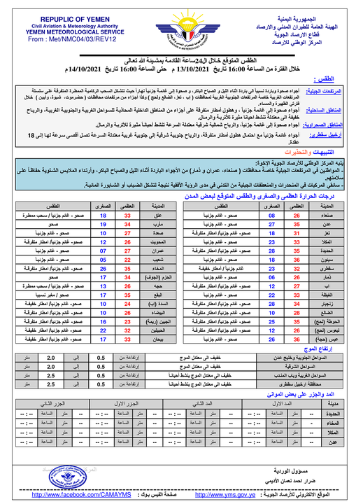 -أجواء صحوة وباردة نسبياً الى باردة اثناء الليل و الصباح الباكر، و صحوة إلى غائمة جزئياً نهاراً حيث تتشكل السحب الركامية الممطرة المتفرقة على سلسلة المرتفعات الغربية خاصة المرتفعات الجنوبية الغربية لمحافظات ( إب ، تعز، الضالع ولحج ) وكذا أجزاء من مرتفعات محافظات ( حضرموت، شبوة، وأبين ) خلال فترتي الظهيرة والمساء.