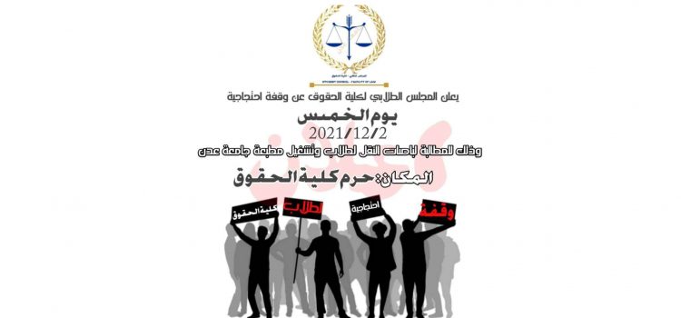 يعتزم طلاب كلية الحقوق بجامعة عدن تنفيذ وقفة احتجاجية؛ تنديداً بارتفاع أجرة المواصلات الناجم عن الجرعة الأخيرة غير المعلنة في أسعار المشتقات النفطية.