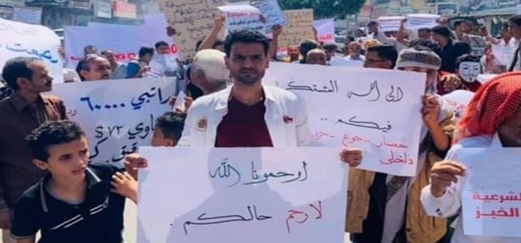 وخرج العشرات في مدينة تعز -السبت- في تظاهرات احتجاجاً على تردي الأوضاع الاقتصادية والمعيشية والانهيار المتواصل في سعر العملة المحلية، مطالبين حكومة هادي بوضع معالجات عاجلة لإنقاذ البلاد.