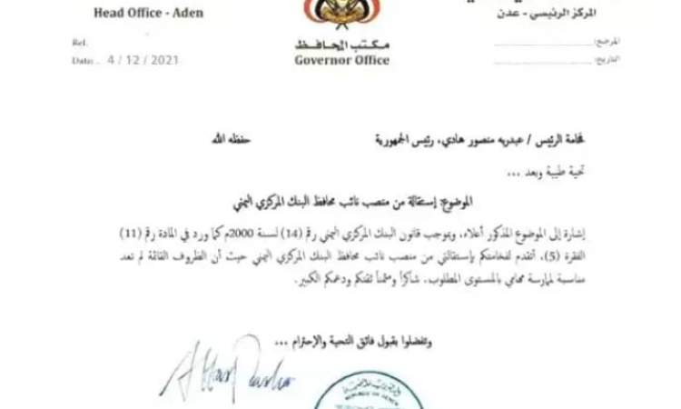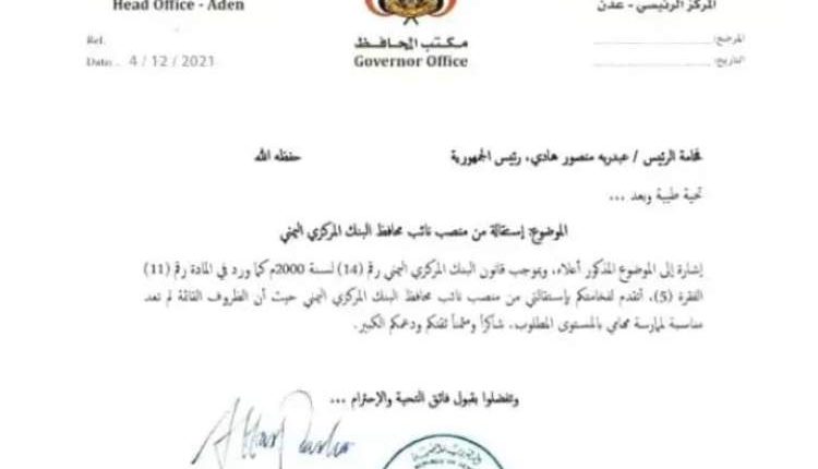 لجأت حكومة هادي التي يراسها معين عبدالملك إلى تسريب وثيقة استقالة مزورة لنائب البنك المركزي اليمني شكيب حبيشي , في محاولة لإمتصاص غضب الشارع في المحافظات الجنوبية والذي يتداعى لثورة شعبية ضد هادي والتحالف .