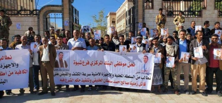 نظم العشرات من موظفي البنك المركزي فرع محافظة شبوة -صباح الأحد- وقفة احتجاجية؛ تنديداً بعملية اغتيال زميلهم “صالح أحمد سالم سلطان الصوة الخليفي”.