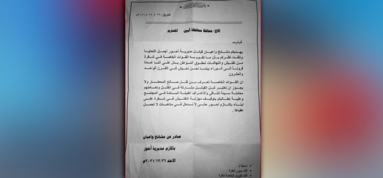 وأشارت “باكازم” -في الرسالة- إلى أن الهدف من النقطة الأمنية التنكيل بأبناء القبيلة وانتهاك حقوقهم بتهمة مقتل قيادي في قوات الأمن الخاصة قبل أسبوع على يد مجاميع مسلحة.