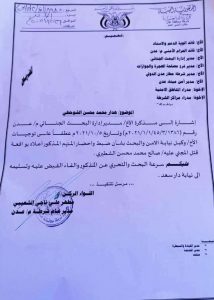 واظهرت الوثيقة التي تداولها ناشطين على مواقع التواصل الاجتماعي، توجيه أمن عدن لـ”البحث الجنائي” وللنقاط العسكرية والأمنية والمنافذ الجوية والبحرية، للقبض على قائد اللواء المدعو “هدار الشوحطي” التابع للإمارات، بتهمة قتل المجني عليه صالح محمد الشطيري، قائد حراسة القيادي في “المقاومة الجنوبية”، أبو همام اليافعي.