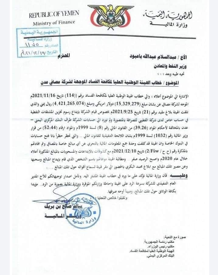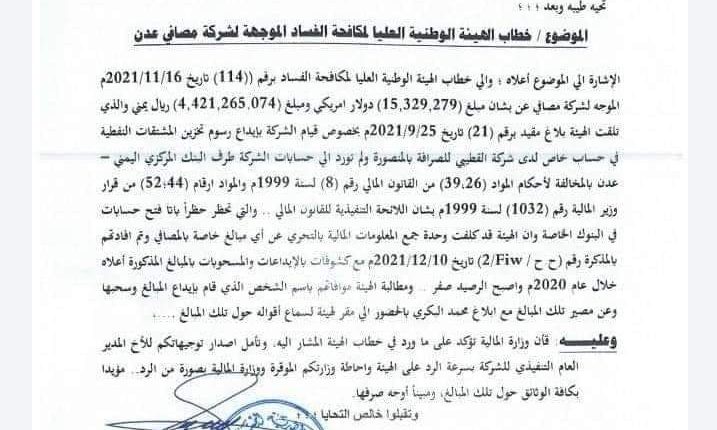 يأتي ذلك عقب الكشف عن إيداع شركة مصافي عدن رسوم تخزين المشتقات النفطية التي تتجاوز 4 مليار و421 مليون ريال يمني ومبلغ 15 مليون دولار في حساب خاص لدى شركة القطيبي ذاتها.