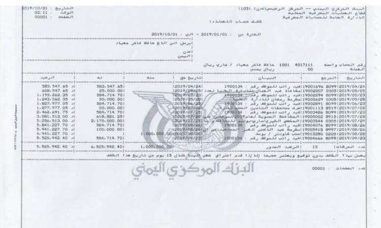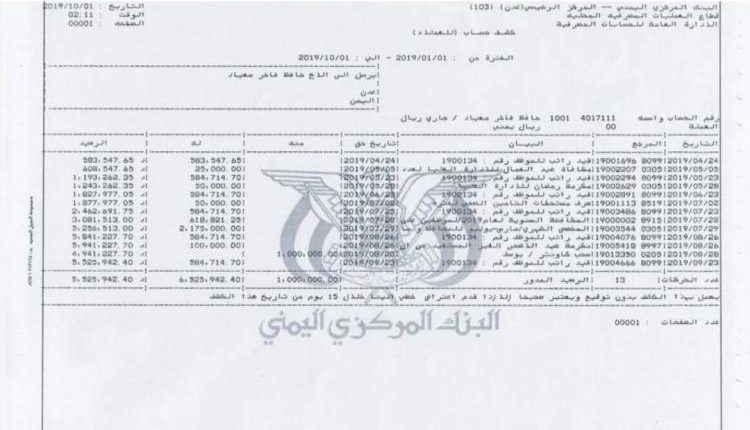 وأظهرت وثيقة صادرة عن قطاع الشؤون المالية والإدارية في البنك، تسلم المعبقي إلى جانب راتبه كمحافظ للمركزي مرتبين آخرين كمسؤول في ديوان وزارة المالية وشركة شبام القابضة التابعة لحكومة هادي.