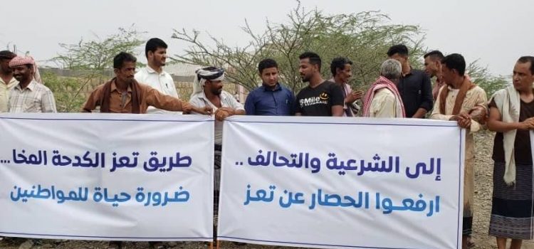 وأكد المحتجون -في بيان لهم- أن إغلاق الطريق الذي يربط بين المخا وتعز، من تلك القوات العسكرية المرتبطة بالتحالف، يعد كارثة إنسانية.