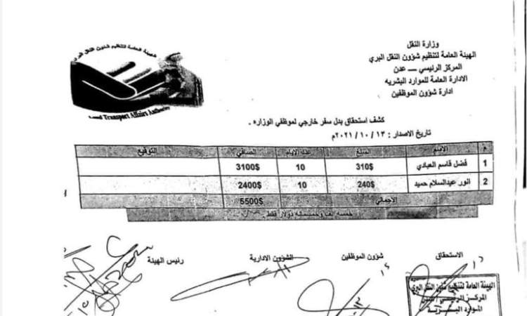 وأظهرت الوثيقة كشف ” بدلات سفر ” خارجية مدفوعة من قبل الوزارة ، لنجل وزير نقل هادي، والتي تتجاوزر قيمة الواحدة منها خمسة آلاف دولار، مؤكدة أن الوزارة تقدم نفقات شخصية لنجل الوزير خارج نطاق العمل.