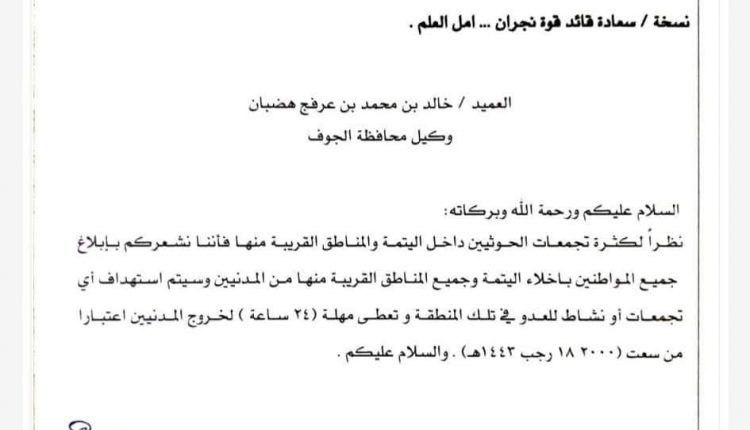 وجّه قائدُ العمليات المشتركة في قوة نجران، أمس السبت، برقية إلى قائد قوة نجران، يطالبه فيها بتوجيه بلاغ لكافة المواطنين في مديرية اليتمة، شمالي محافظة الجوف التي يتجاوز تعداد سكانها عشرات الآلاف، بسرعة إخلاء المديرية بشكل كامل خلال 24 ساعة تمهيدًا لشن عملية عسكرية تستهدف كل شيء متحرك فيها.