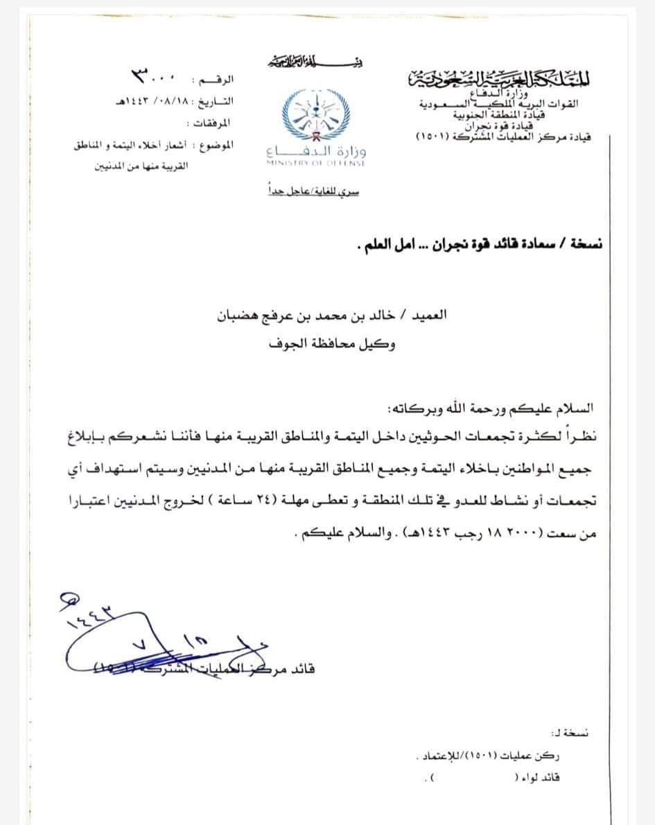 وجاء في الوثيقة الصادرة من وزارة الدفاع السعودية، برقم (3000) وتاريخ 18 رجب 1443هـ ، “نظراً لتواجد الحوثيين بالقرب من قرى اليتمة فإننا نشعركم بإبلاغ جميع المواطنين بإخلاء اليتمة والمناطق القريبة منها خلال 24 ساعة، وسيتم استهداف أي تجمعات أو نشاط في تلك المنطقة”.