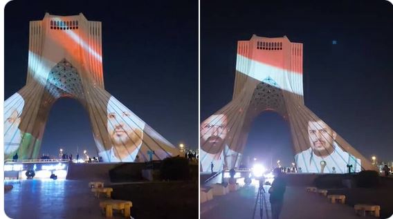 زينت ايران، السبت، معالمَها التاريخية بصور قادات حركة انصار الله “الحوثيين” واعلام اليمن..