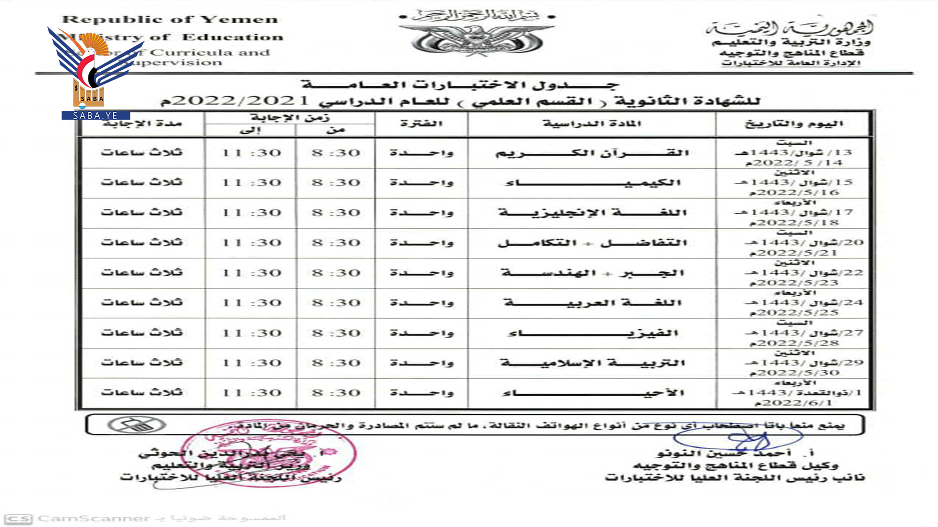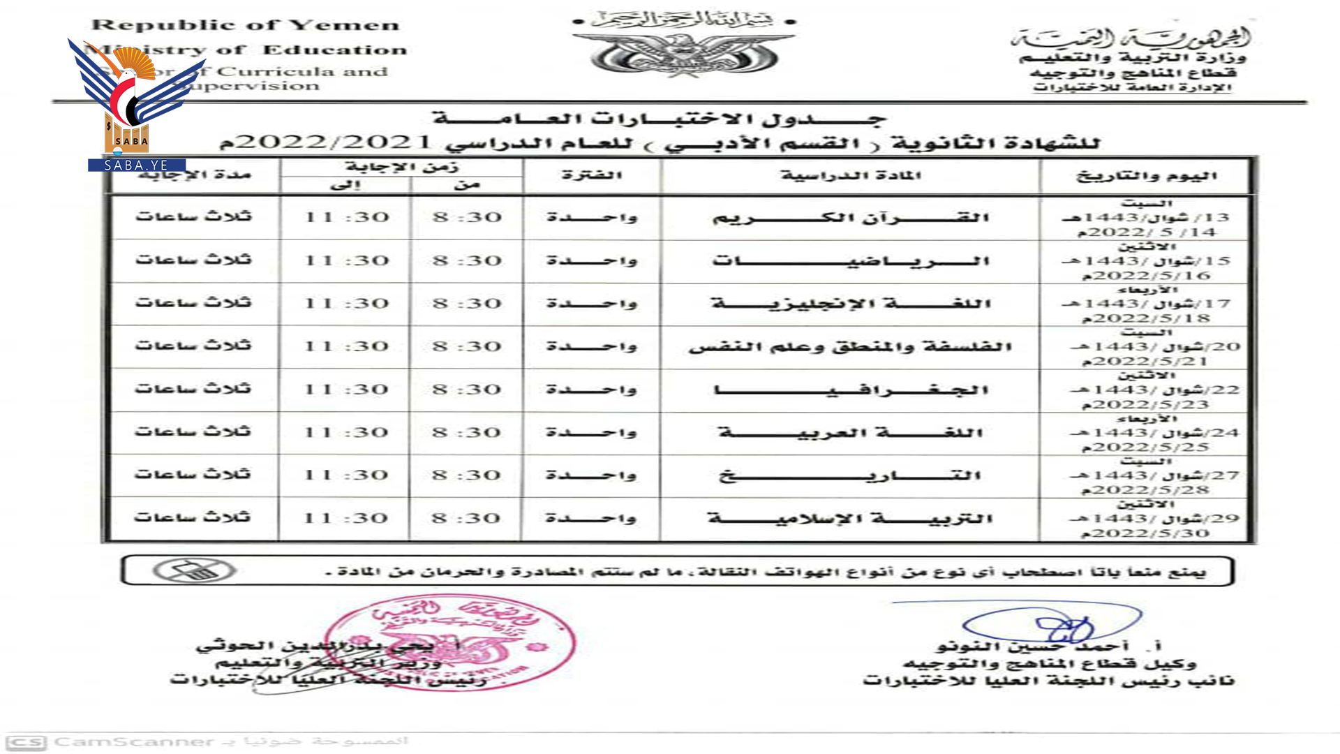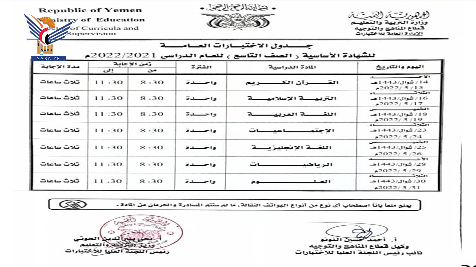 أعلنت وزارة التربية والتعليم بصنعاء جداول سير الاختبارات النهائية للشهادة العامة الأساسية والثانوية بقسميها العلمي والأدبي للعام الدراسي 1443 هجرية.