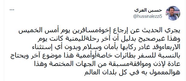 وأوضح العزي أن الأمرَ المثيرَ للجدل أن مسافرين  كانوا يحاولون السفر عبر رحلة اممية خاصة ، متجاوزين برتوكولات رسمية تتعلق  بالحصول على إذن مسبق من الجهات الرسمية وهو ما لم يتم.