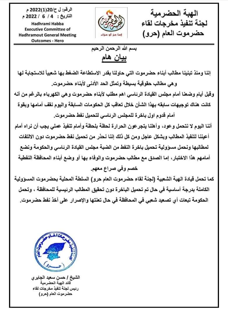 كما حمل الحكومة تبعات أي تصعيد شعبي في المحافظة “في حال استمرار تعنتها والإصرار على أخذ نفط حضرموت” حد تعبيره، في تهديد مباشر بإيقاف تصدير النفط من حضرموت إلى الخارج.