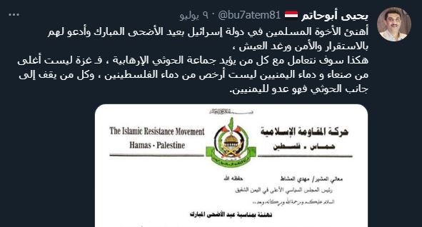 جاء ذلك في تغريدة لأبو حاتم على منصة (تويتر)، على خلفية تهنئة حركة حماس لرئيس المجلس السياسي الأعلى بصنعاء مهدي محمد المشاط بمناسبة عيد الأضحى.