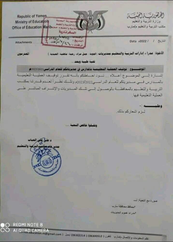 حصل موقع “متابعات” على تعميم من مكتب التربية والتعليم بمحافظة مأرب وجه فيها بإيقاف العملية التعليمية في خمس مديريات.