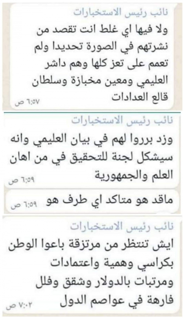 وقال نائب رئيس هيئة الاستخبارات والاستطلاع في وزارة دفاع حكومة معين اللواء حسين عمران، في رسائل نصية مسربة، إن “بيان العليمي عن المواجهات في مدينة عتق برر الانتهاكات”.