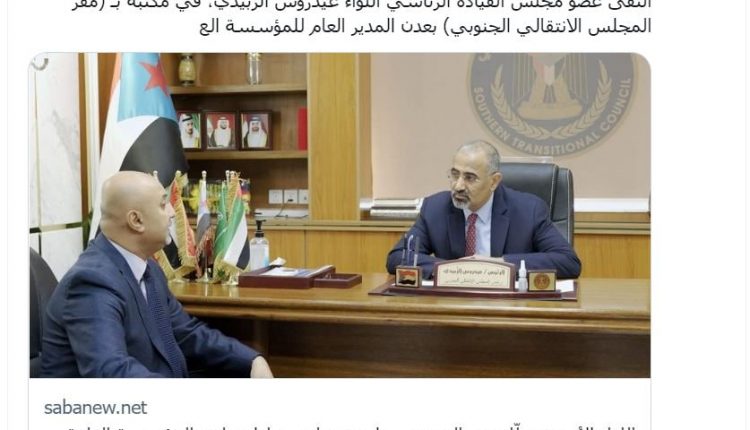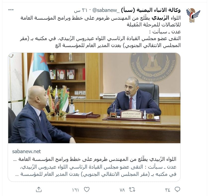 نشرت وكالة سبأ التابعة لحكومة التحالف خبرا عن لقاء عيدروس الزُبيدي، يوم الأحد، بالمدير العام للمؤسسة العامة للاتصالات وائل محمود محمد طرموم، في مكتبه بـ “مقر المجلس الانتقالي الجنوبي” في عدن، وأرفقت مع الخبر صورة للقاء تظهر علم الانفصال (علم الشطر الجنوبي قبل الوحدة) وصور حكام الإمارات، وذلك بعد أيام من إهانة ودوس علم الجمهورية اليمنية في شبوة