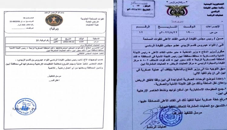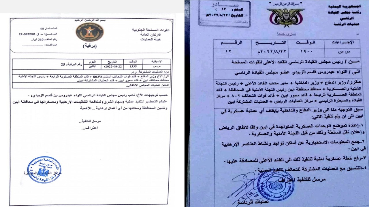 وأشارت الوثيقة إلى أن توجيهات العليمي السابقة قضت بإعادة تموضع القوات العسكرية وفقا لاتفاق الرياض، وجمع المعلومات الاستخبارية عن أماكن تواجد ونشاط العناصر الإرهابية في أبين، رفع خطة عسكرية أمنية لتنفيذ ذلك إلى القائد الأعلى للمصادقة عليها، التنسيق مع العمليات المشتركة للتحالف لتنفيذ العملية).