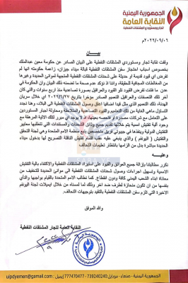 ودعت النقابة في بيان صادر عنها إلى تسهيل إجراءات وصول شحنات المشتقات النفطية إلى موانئ الحديدة للتخفيف من معاناة الشعب اليمني.