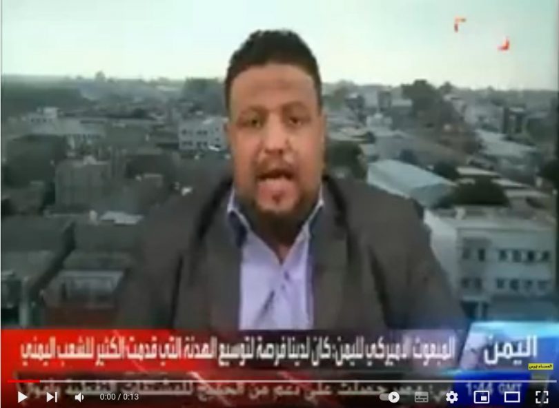 وقال المحلل الذي ظهر على قناة الحدث إن إيران دعمت صنعاء بأسلحة نووية، وإن هذا الدعم يستوجب على التحالف وحكومة رشاد العليمي وقف الهدنة وعودة الحرب.
