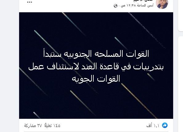 وكتب عضو “هيئة الإعلام الجنوبي” في المجلس الانتقالي – رئيس تحرير صحيفة الأمناء، عدنان الأعجم، منشوراً على صفحته في “فيس بوك” الساعة 12:38 فجراً قبل ساعات من الانفجارات بأن “القوات الجنوبية ستبدأ بتدريبات في قاعدة العند لاستئناف عمل القوات الجوية”.