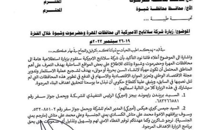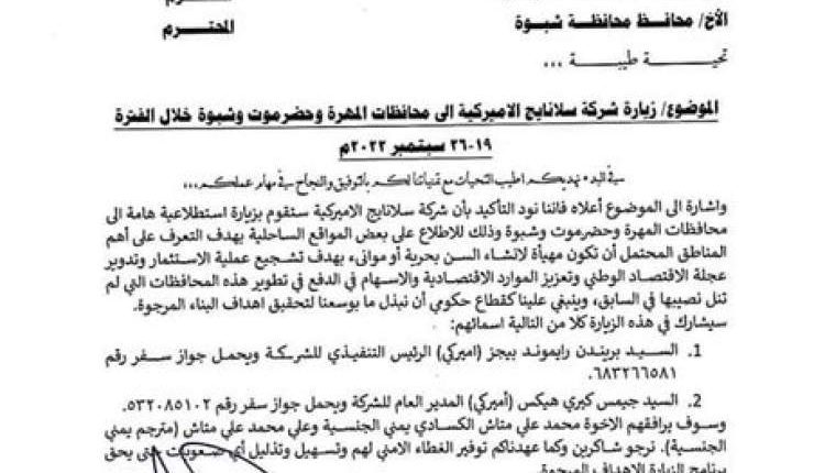 واظهرت وثيقة رسمية صادرة من وزارة النقل عن قيام فريق من سلانايح الامريكية بعملية مسح للسواحل في محافظات حضرموت والمهرة وشبوة.