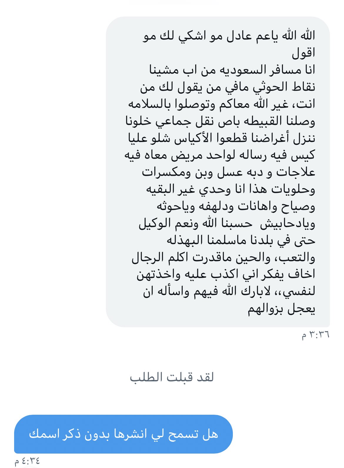 وتشير الرسالة بحسن التعامل الذي لمسه المسافرون عند مرورهم من النقاط الأمنية للحوثيين ،