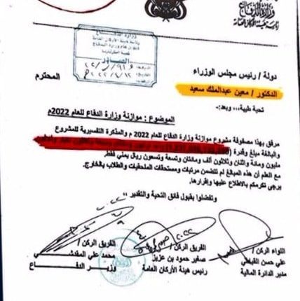 وبحسب الوثائق المسربة فقد بلغت موازنة وزارة الدفاع  لحكومة التحالف للعام  2022 ترليون و237 مليار ريال ، فيما بلغت مرتبات مسلحي التحالف 462 مليار ريال .