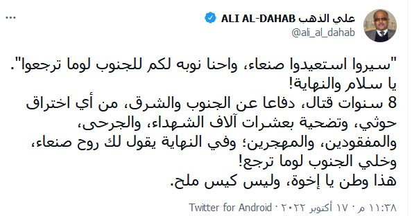 واشار الخبير العسكري في الحزب، علي الذهب، في سلسلة تغريدات على صفحته بمواقع التواصل الاجتماعي إلى أن الهدف اخراج القوات المتمركزة في حضرموت والمهرة..