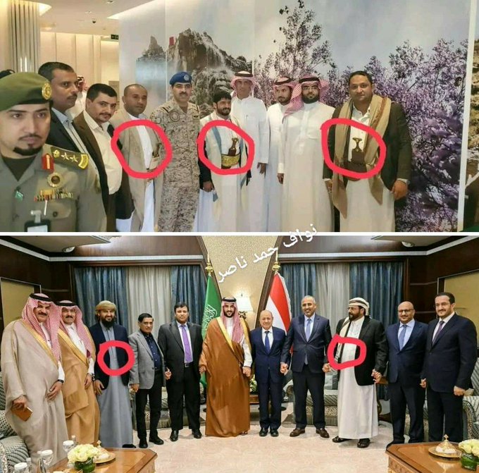 وفيما ظهر وفد صنعاء بزيه الرسمي الشعبي اليمني الأصيل الذي من جملته “الجنبية اليمنية” أو ما يعرفه العرب بالخنجر اليمني، يظهر الموالون للسعودية في الرياض باللباس اليمني الناقص والذي يعتبرا عيبا كبيرا عند قبائل اليمن، أن تظهر في مناسبة مهمة، وأنت كما يقول اليمنيون “مسري” بدون جنبية”.