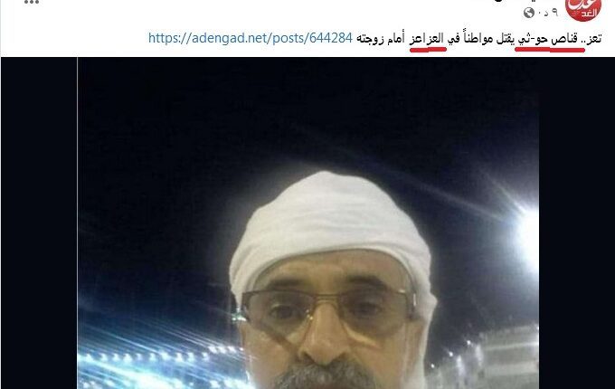 وذهب الموقع التابع للصحفي الجنوبي فتحي بن لزرق، لنشر خبر بأن “قناصاً حوثياً قتل مواطناً أمام زوجته في منطقة العزاعز بمديرية الشمايتين”.