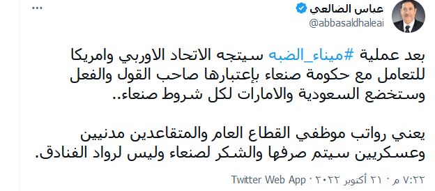 وأشار عباس الضالعي، المحسوبُ على الإصلاح، إلى أن الاتحادَ الأوروبي والولايات المتحدة  ستتجهان للتعامل مع صنعاء مباشرة باعتبارها صاحبةَ القول والفعل.. كما ستخضعُ السعودية والامارات لكُلِّ شروط صنعاء وهو ما يعني صرف المرتبات  لكافة موظفي الدولة مدنيين وعسكريين .
