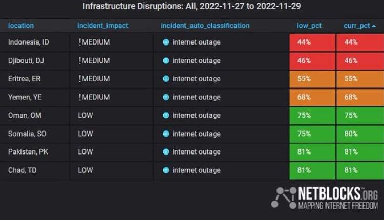 وأفادت وزارة الاتصالات الباكستانية، وفق وسائل إعلامية، بأن   الكابل البحري  سموا -5،  والذي يزود عددا من دول المنطقة ابرزها اليمن تعرض للقطع  في مديني الزعفرانة  وأبو طالب  المصرية.